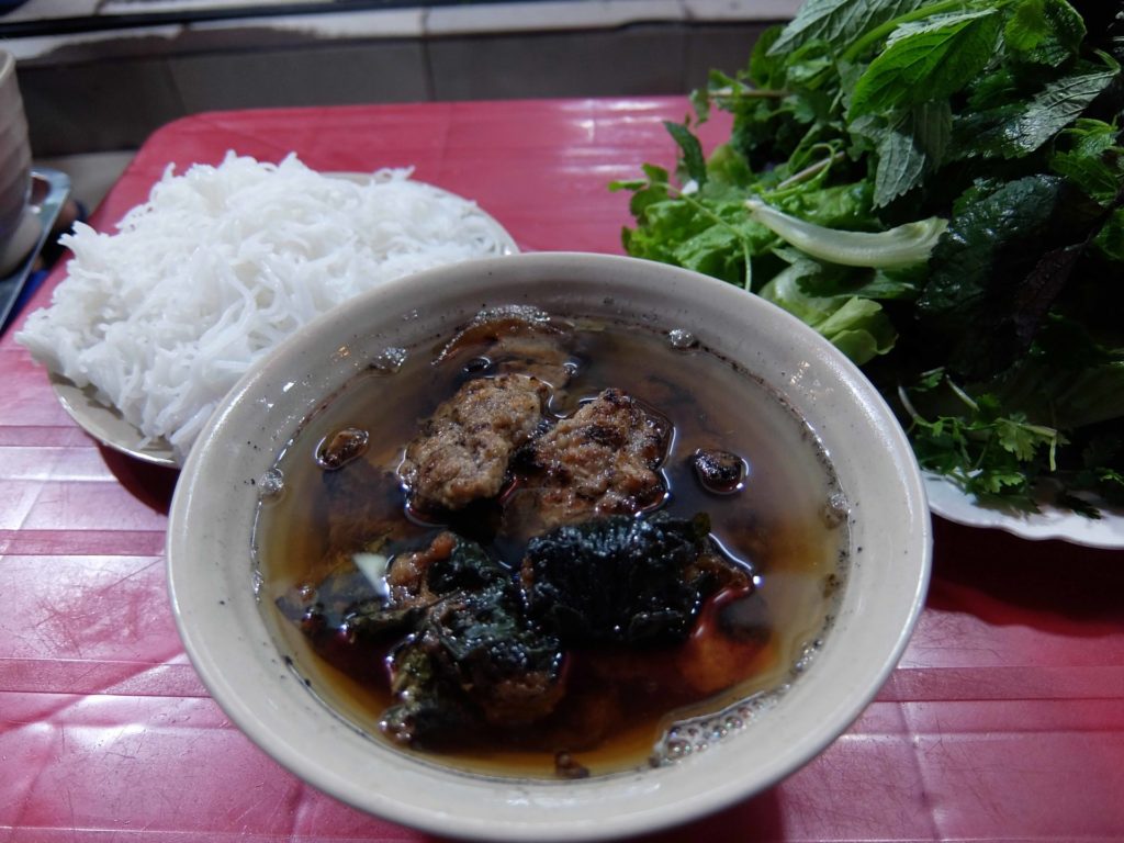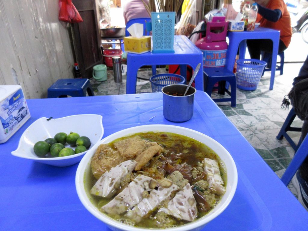 これまたトマトの酸味の効いた、ブンを使った麺料理。具材には ốc =巻き貝(食用タニシ)を使ってあるので、ブンオック(Bún ốc)と呼ぶ。タニシだなんて、これまた日本ではお目にかかれない。というか、タニシを初めて食べたのは、ここハノイだった。