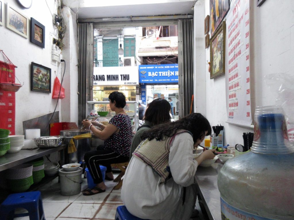 やって来たのは、Bún riêu cua Hàng Bạcというお店。間口がめっちゃ狭い。細長い店内は、席の数も少ない。そして美味しい。
