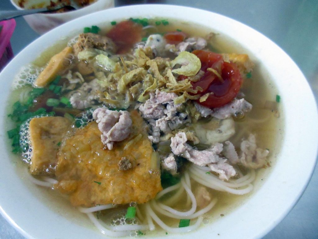 ブンリュウ(Bún riêu)は、トマトの酸味の効いたスープに、ブンという細い麺を入れたもの。ここに淡水の田ガニ(cua)のすり身を入れたものを、ブンリュウクア(Bún riêu cua)と呼ぶ。淡水のカニの入った料理なんて、日本ではなかなかお目にかかれない。ハノイの旧市街の路上の朝市を歩けば、この小さな田ガニをすりつぶしている光景を見ることができる。