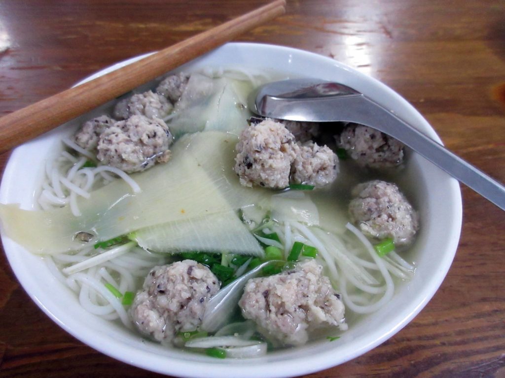 最後は、珍しい(と思う)タケノコ入りのブン。日本で食べるタケノコと食感も同じだ。馴染みの食材が混ざっていると、ホッとした心地になる。何かのすり身の肉団子もたくさん入っていて、けっこうお腹がいっぱいになる。あっさりした味付けなので、個性的な味付けに舌が疲れた時にちょうど良い感じ。