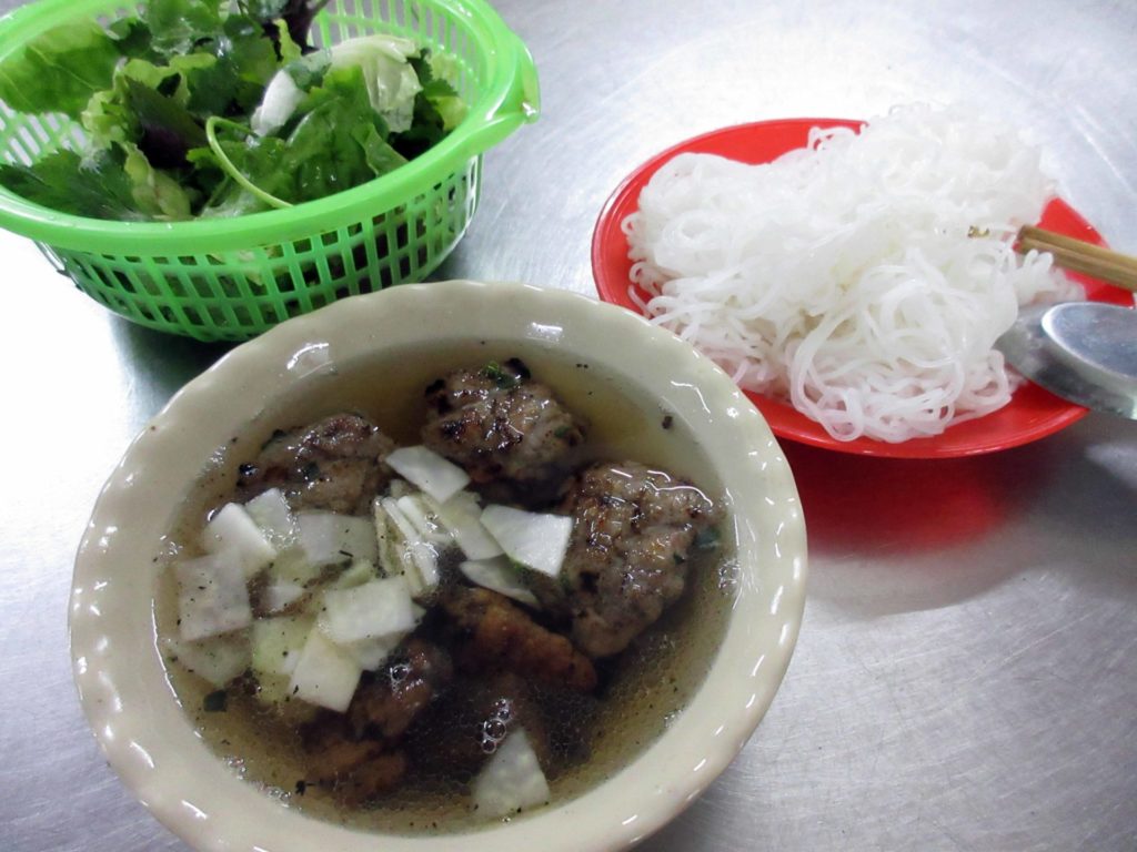 ブンチャー(Bún Chả)は日本のベトナム料理屋でもよくお目にかかる麺料理。甘酸っぱいつけ汁に、ブンやパクチーをからめて食べる。つけ汁には焼いた豚肉が入っていて、これまた旨味があって美味しい。