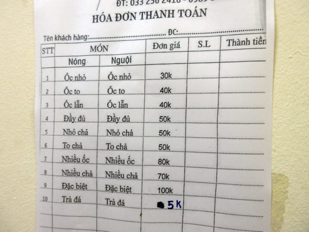 そして、私が朝食を食べたのは、Bún ốc cô Huệというお店。朝ごはん時は地元の人らで繁盛していた。メニューを見てもよく分からないので、ネットで探した写真を見せながら「全部乗せ」っぽいものを頼んだ。写真のメニュー表で、たぶん「4」のものだ。「nóng」は熱いスープ、「nguội」は冷ましたスープを示している…と思う。