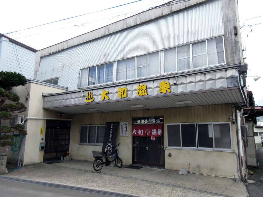 黒石駅を出て、まずは津軽尾上駅から駅近の温泉銭湯「大和温泉」を目指す。駅近というか、駅至近だ。駅舎を出ると、もう、大和温泉の建物の姿がちらっと見える。