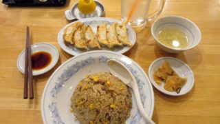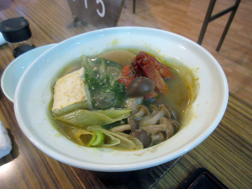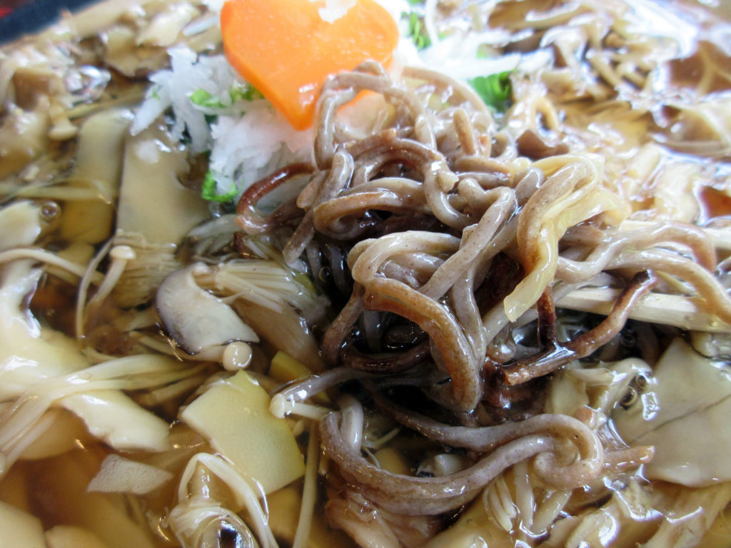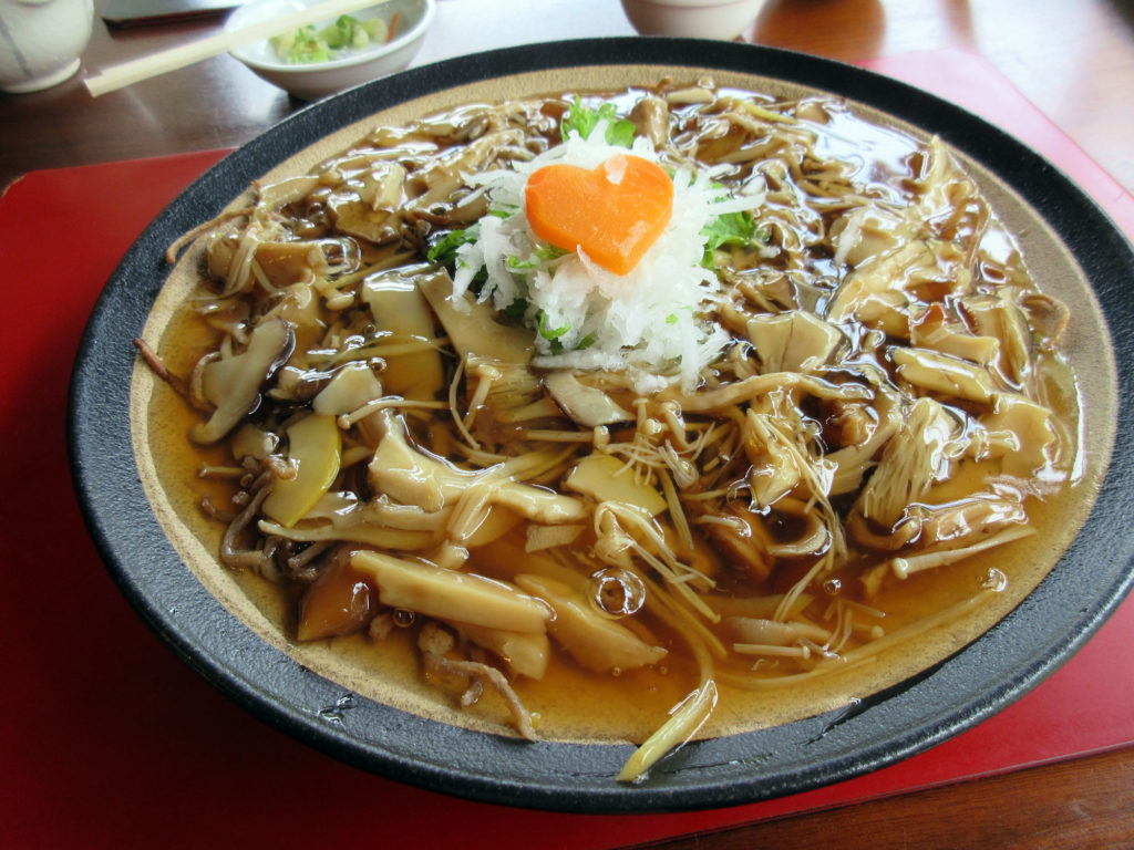 いわゆる「焼きそば」ではなくて、蕎麦を焼いたもの。そこにキノコ類たっぷりのあんかけ。これがとても合っていて、美味しかった。
