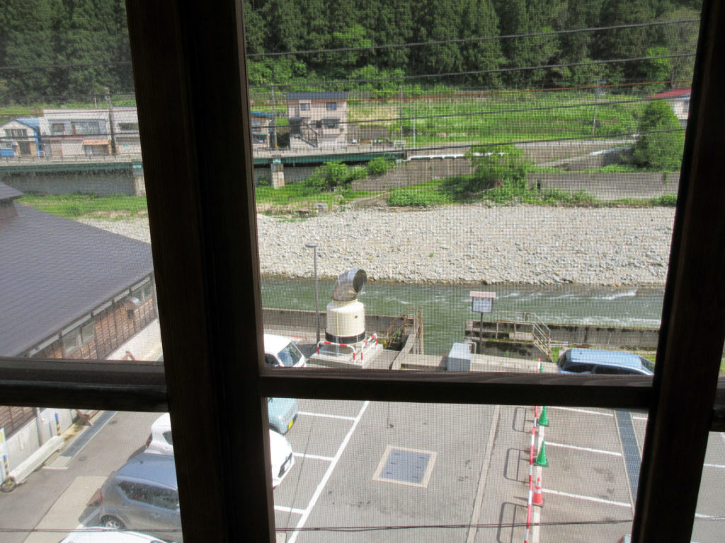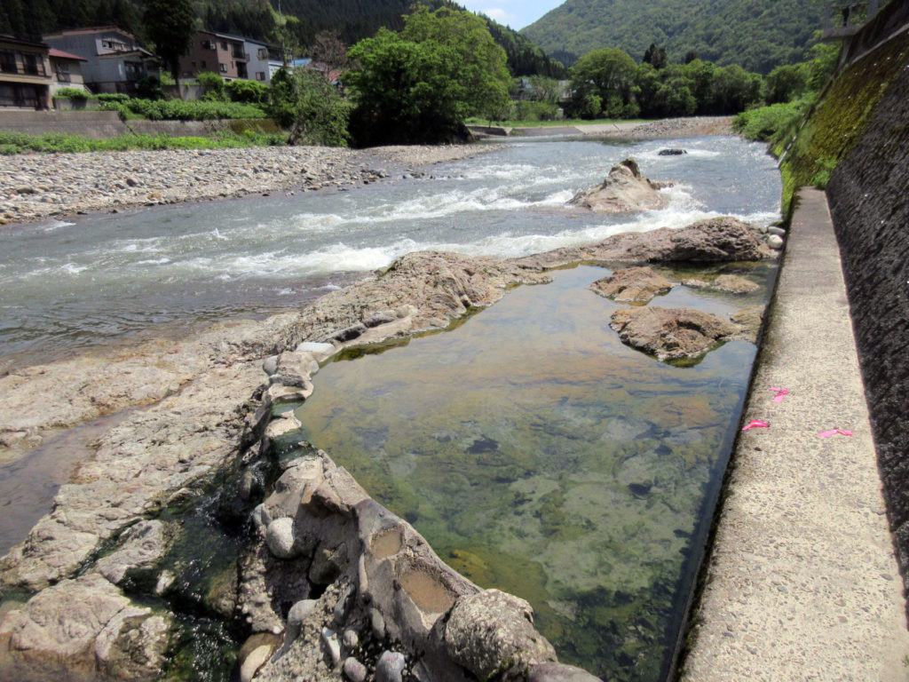 宿の目の前を流れる小国川沿いには、「薬研湯」という露天風呂がある。丸見えである。