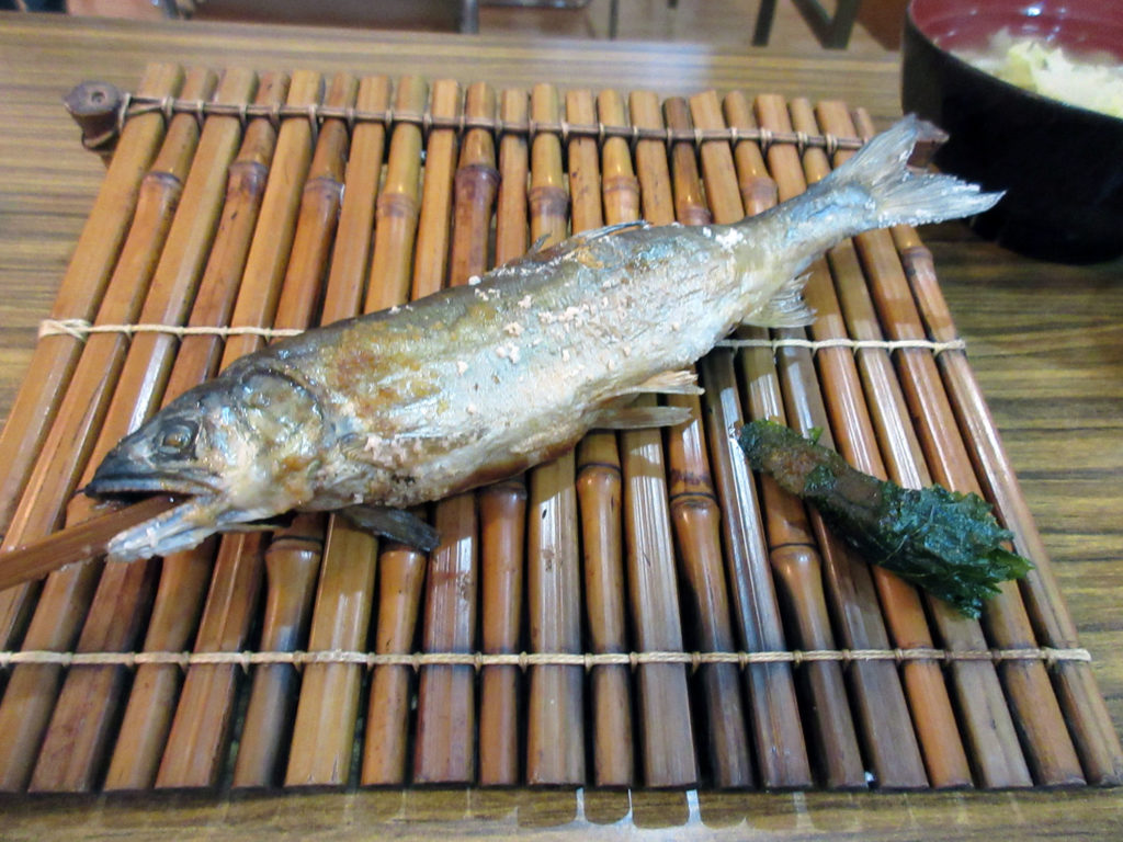 今回の喜至楼の宿泊は2食付きで予約(周囲で食事できる場所があるのか不明だった)。派手さはないものの、地元の食材を活かした料理なのだろう。鮎の塩焼きや、モクズガニを使ったお鍋など、素朴な品々が並んでいた。